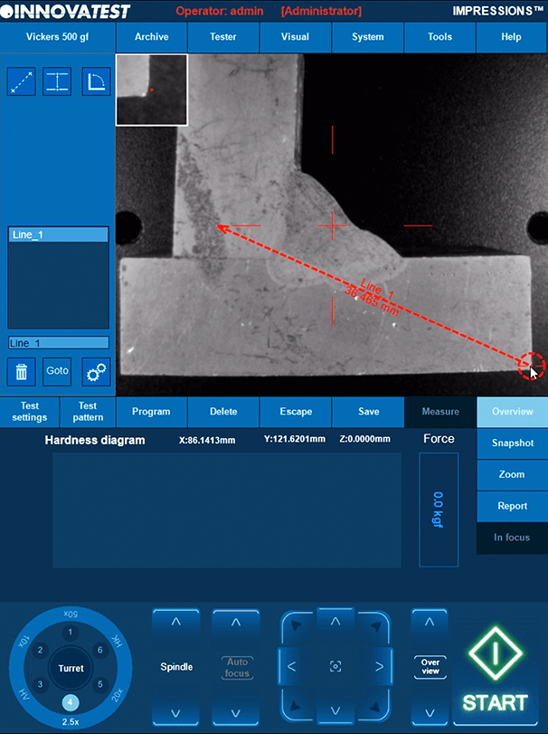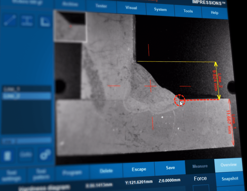 Esta ferramenta especialmente desenvolvida permite a realização de testes de dureza em peças ou segmentos soldados de acordo com a norma ISO. A configuração do padrão de acordo com os requisitos torna-se “fácil”, devido aos pontos de teste predefinidos nas diferentes zonas da solda e à correlação automática entre os pontos de teste. O sistema executará um procedimento de teste totalmente automático e exibirá e registrará os resultados de acordo. O O Gerador de Relatórios foi aprimorado com recursos de relatório para esta aplicação.