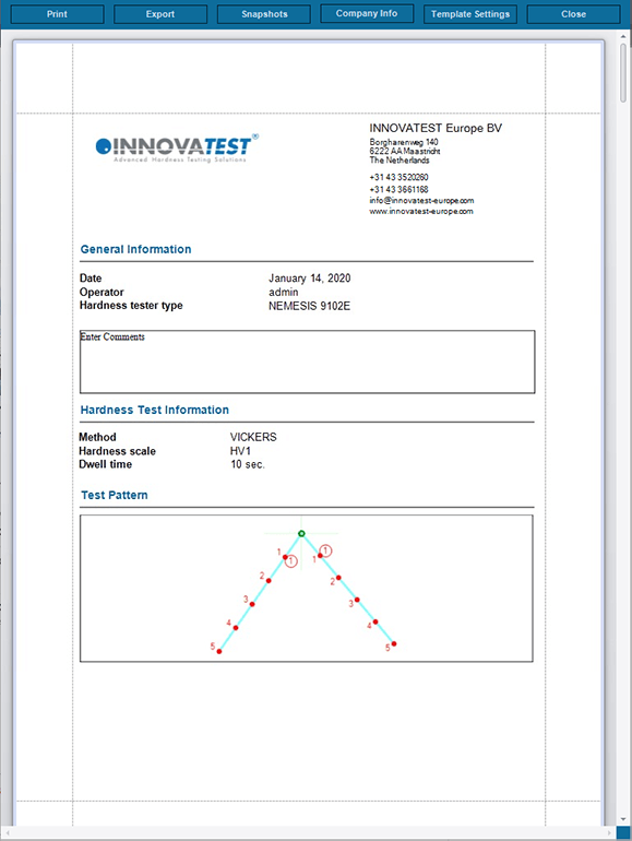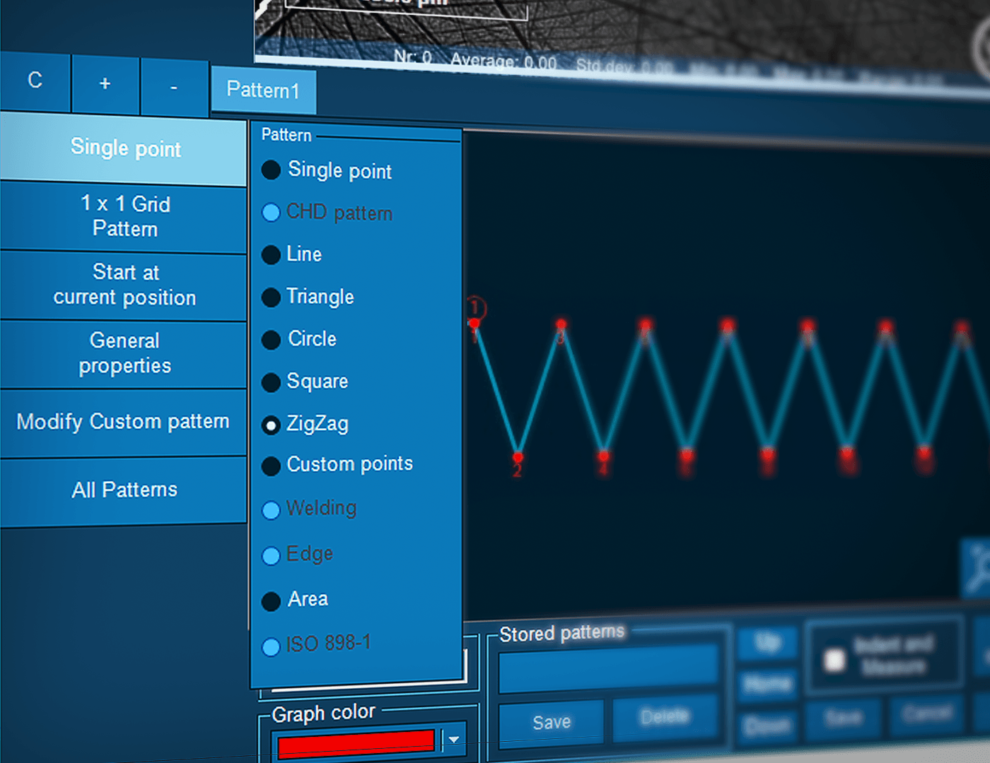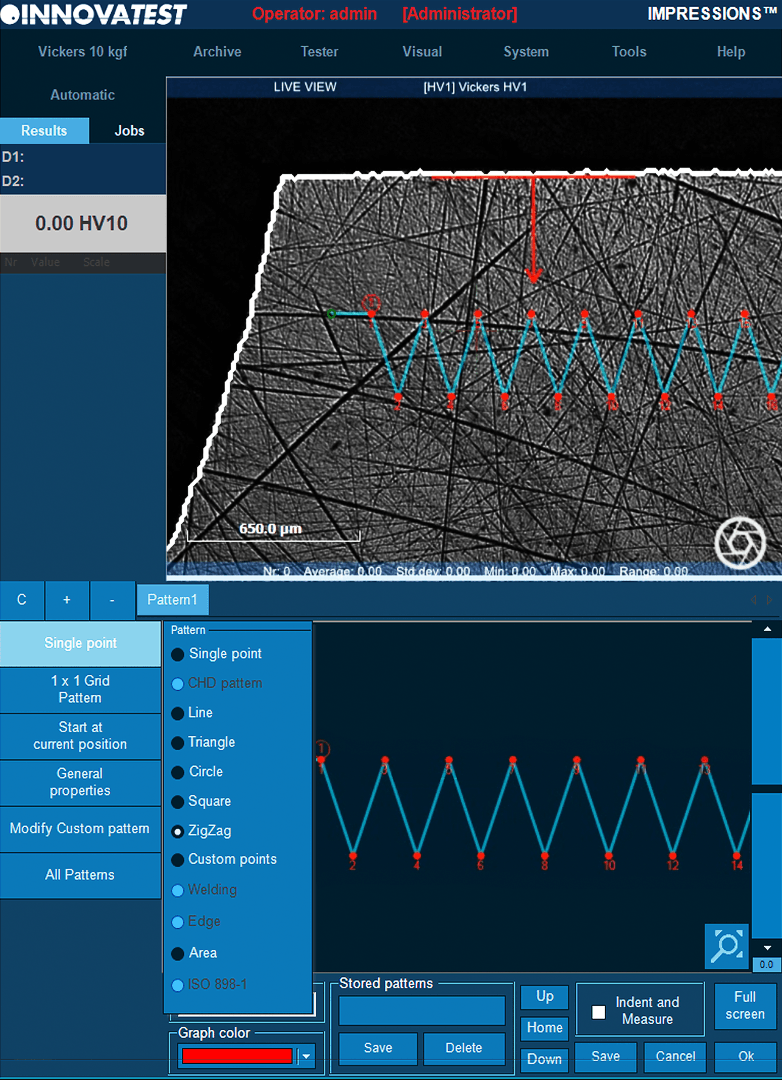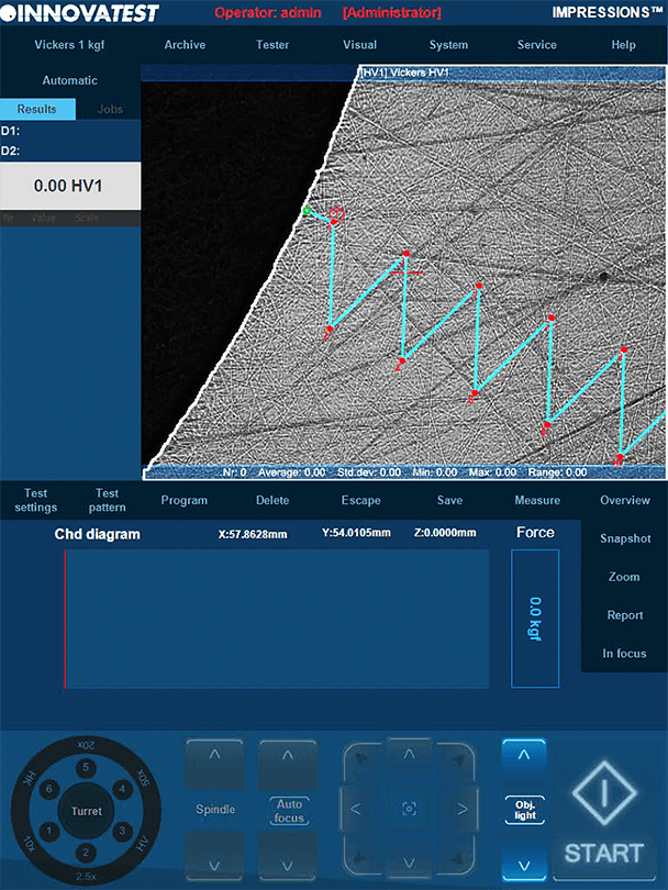 Posteriormente, um número ilimitado de pontos de teste pode ser inserido na imagem digitalizada, ou ser definido em distâncias selecionadas (offset), em relação à borda. Esta funcionalidade avançada permite que o procedimento de teste de dureza seja realizado atomicamente. Esta é uma excelente funcionalidade a ser combinada com o mapeamento da dureza 2D ou 3D, também conhecido como “gráfico de dureza plana”.